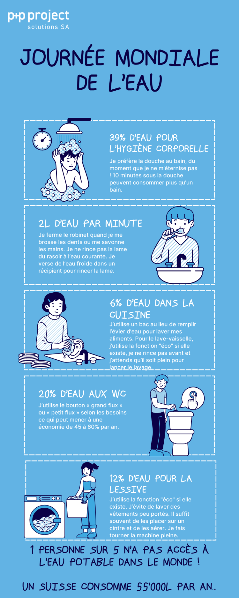 p+p project solutions SA s’est engagé envers les Objectifs de Développement Durable (ODD), notamment les ODD 12 (Consommation et productions responsables) et 13 (Action climatique), ce qui implique notre détermination dans une gestion de l’eau respectueuse et durable. En tant que membre actif du répertoire Swiss Triple Impact, il est au cœur de notre mission de sensibiliser toutes nos parties prenantes, qu’il s’agisse de nos collaborateurs, clients ou prestataires, aux défis de la transition énergétique et à la nécessité de préserver nos ressources naturelles. A travers les programmes Eco-logement et Eco-PME, nous accompagnons les particuliers et les entreprises dans cette démarche. Ensemble, engageons-nous pour que la conservation de l’eau devienne une priorité de chaque instant, et non seulement lors de journées dédiées.